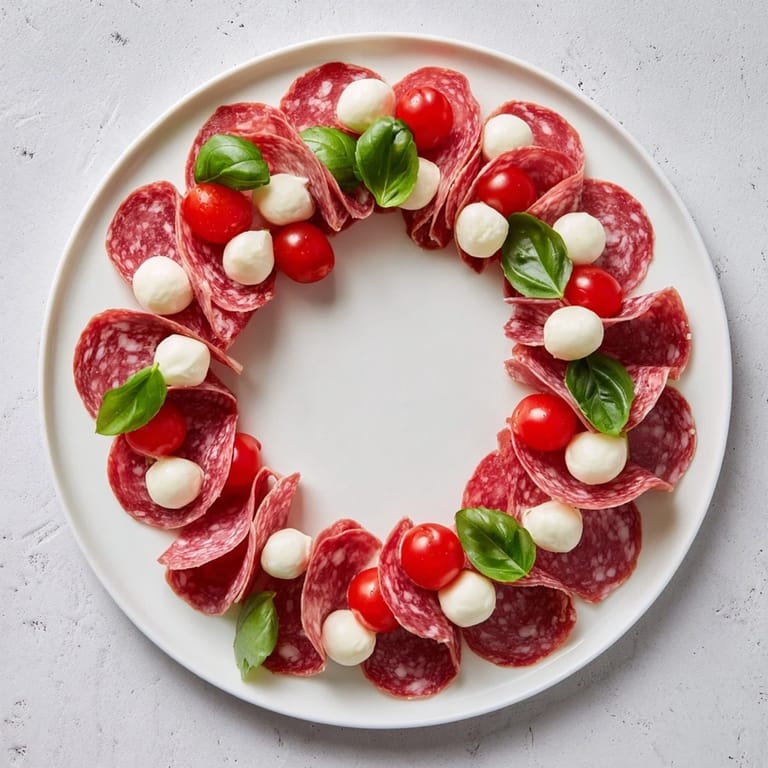 Save A striking and simple appetizer featuring thinly sliced salami artfully folded and arranged in a wreath patternβideal for festive gatherings or charcuterie boards.
