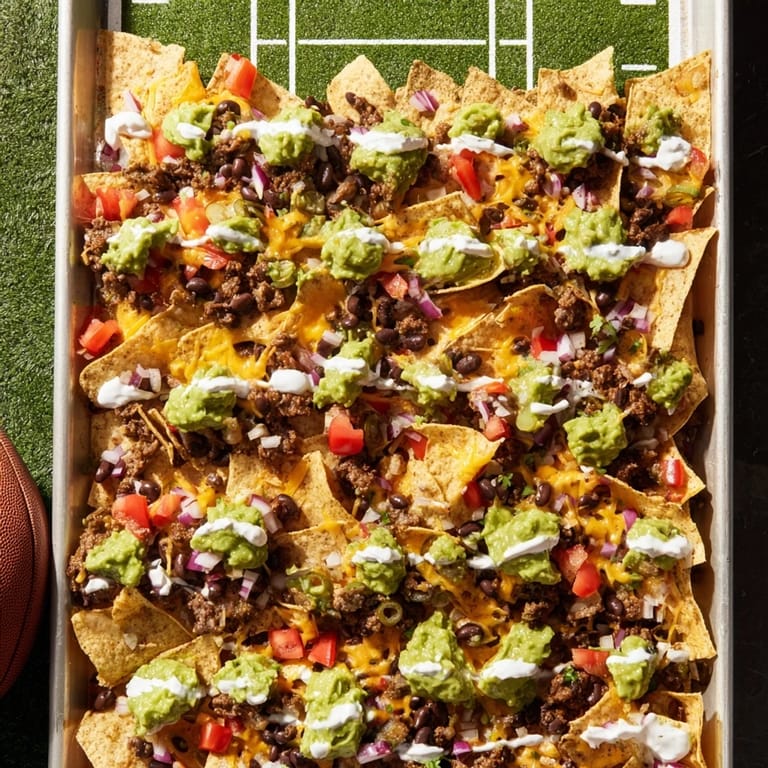 Save A festive, crowd-pleasing nacho platter arranged and decorated to resemble a football field—perfect for game day gatherings.