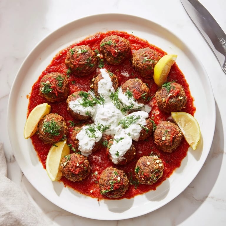 Save Juicy, herbed meatballs simmered in a savory tomato base, topped with a creamy lemon-feta sauce an easy weeknight dinner bursting with Mediterranean flavor.