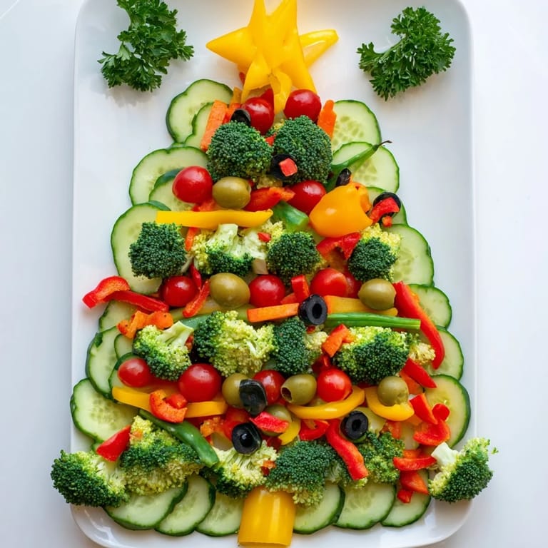 Save A festive and colorful vegetable platter arranged in the shape of a Christmas tree, perfect for holiday gatherings. Nutritious, eye-catching, and easy to assemble.