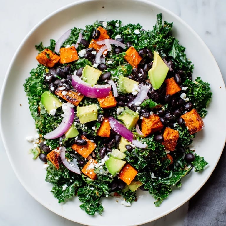 Save A vibrant, nutrient-packed salad featuring tender kale, roasted sweet potato, hearty black beans, and a zesty lime dressing. Perfect as a light lunch or a flavorful side.