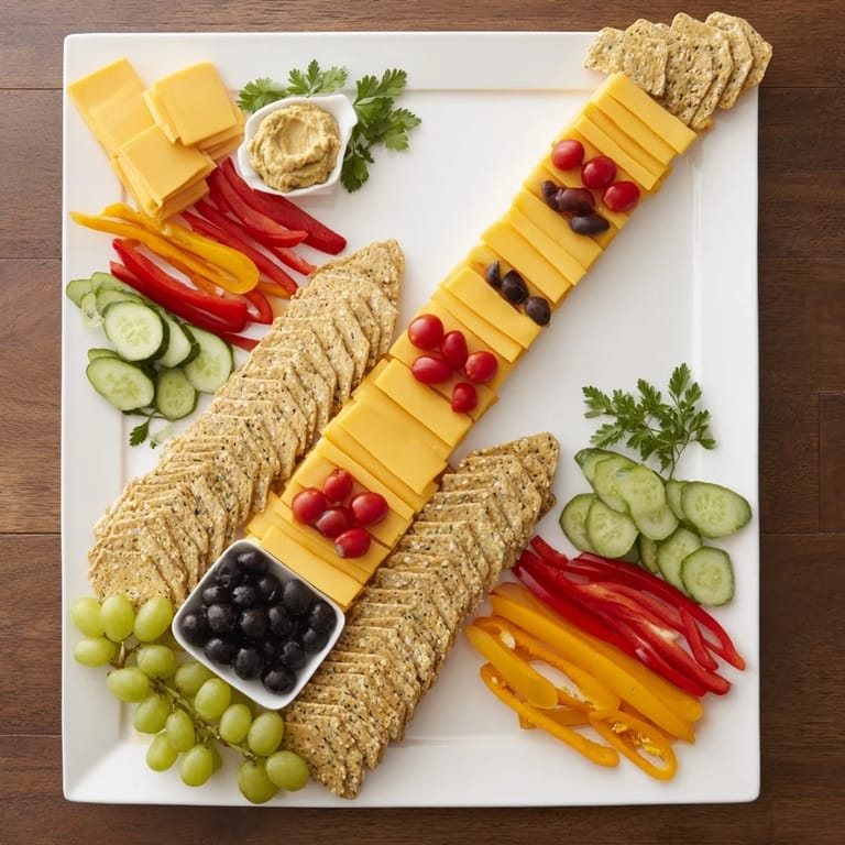 Save A bold, crowd-pleasing snack platter inspired by the energy of rock concerts, featuring a creative guitar-shaped arrangement of savory bites and dips—perfect for parties and music lovers.