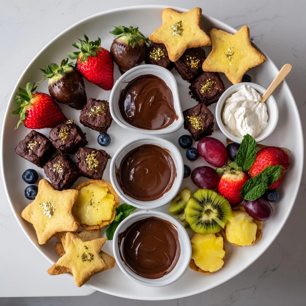 Edible gold or silver star sprinkles combined with fresh mint leaves add sparkle and freshness, elevating the platter’s presentation.