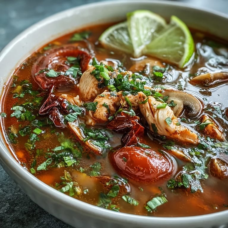 Save I discovered Tom Yum at a cramped Bangkok street stall during monsoon season, watching a vendor work with such speed that the ingredients seemed to blur together. The moment that steaming bowl arrived, fragrant and alive with lemongrass and lime, I understood why this soup feels less like food and more like a warm conversation. Years later, I still chase that same electric balance of sour, spicy, and savory whenever I make it at home. There's something about the way the aromatics infuse the broth that transforms simple chicken and vegetables into something unforgettable. Now it's the soup I turn to when I want the kitchen to smell like somewhere far away.