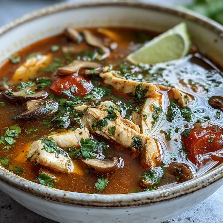 Save The first time I tasted authentic Tom Yum Gai was at a tiny stall in Bangkok during monsoon season, steam rising from the pot mixing with the rain outside. The vendor moved with such casual precision, dropping ingredients into boiling broth like she was painting a picture she'd made a thousand times. What struck me wasn't just the heat or the sourness, but how each spoon somehow balanced all those competing flavors at once—tangy, spicy, aromatic, clean. Years later, I finally understood why: she wasn't fighting those elements against each other, she was letting them dance together.